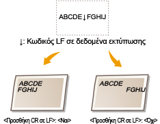 Επιλέξτε εάν θα γίνεται προσάρτηση ενός χαρακτήρα επαναφοράς (CR) όταν η συσκευή θα λαμβάνει κωδικό αλλαγής γραμμής (LF). Εάν επιλέξετε <Ναι>, η θέση εκτύπωσης θα μετακινείται στην αρχή της επόμενης γραμμής όταν η συσκευή λαμβάνει κωδικό LF. Εάν επιλέξετε <Όχι>, η θέση εκτύπωσης θα μετακινείται στην επόμενη γραμμή, ακριβώς κάτω από τον ληφθέντα κωδικό LF.
