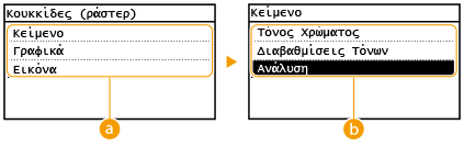 Επιλέξτε το αντικείμενο για το οποίο πρόκειται να αλλάξετε τη ρύθμιση. Η επιλογή <Κείμενο> αντιπροσωπεύει γράμματα και χαρακτήρες, η επιλογή <Γραφικά> αντιπροσωπεύει γραμμές και ψηφία και η επιλογή <Εικόνα> αντιπροσωπεύει φωτογραφίες και εικόνες.
