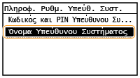 Εάν προσπαθήσετε να αποκτήσετε πρόσβαση στις επιλογές <Ρυθμίσεις Δικτύου> ή <Ρυθμίσεις Διαχείρισης Συστήματος>, όταν είναι ενεργοποιημένος μόνο ο Κωδικός Υπεύθυνου Συστήματος, εμφανίζεται η παρακάτω οθόνη σύνδεσης: