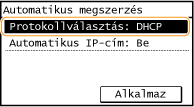![]() Ha a <Be> érték látható, akkor érintse meg az <Automatikus megszerzés> gombot, majd a <Protokollkiválasztás> és az <Automatikus IP-cím> beállítását állítsa <Ki> értékre.