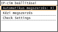 ![]() ![]() Ha nem a DHCP/BOOTP/RARP lehetőséget akarja használni IP-címek kiosztására Válassza a <Ki> lehetőséget. Ha a <DHCP>, <BOOTP> vagy <RARP> lehetőséget választja, de a megfelelő szolgáltatás nem érhető el, akkor a készülék fölöslegesen fordít időt és kommunikációs erőforrásokat az adott szolgáltatás hálózaton történő keresésére. |