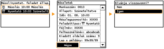 Megszakítás a Távoli felhasználói felület segítségévelA nyomtatás megszakítható a Távoli felhasználói felület [Nyomtatás: Feladat állapota] oldalán: A nyomtatott dokumentumok aktuális állapotának ellenőrzése
