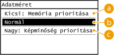 Megadhatja, hogy a beolvasott dokumentumokat a program JPEG formátumba konvertálja, mekkora legyen a tömörítési arány. <Kicsi: Memória prioritása> választása esetén a tömörítési arány a szokásosnál nagyobb lesz, így alacsonyabb képminőségű, de kisebb fájlok jönnek létre. A <Nagy: Képminőség prioritása> választása esetén ezzel szemben a szokásosnál alacsonyabb a tömörítési arány, tehát jobb képminőségű és nagyobb fájlok jönnek létre.