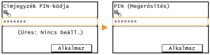 Beállítható, hogy a felhasználóknak PIN-kódot kelljen megadniuk, ha új bejegyzéseket szeretnének hozzáadni a címjegyzékhez, vagy ha szerkeszteni szeretnék a meglévőket. Ha PIN-kódot állít be a címjegyzékhez, azzal csökkentheti annak kockázatát, hogy illetéktelen címzetteknek küldjenek dokumentumokat, mivel a címjegyzéket csak azok a felhasználók módosíthatják, akik ismerik a PIN-kódot.