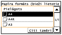 Papīra formāti bez atzīmes ir parādīti <Papīra formāts (citi izmēri)> ekrānā.