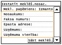 Lai meklētu adresātus, varat izmantot tādus kritērijus kā vārds, faksa numurs, e-pasta adrese, uzņēmuma nosaukums un organizācijas nodaļas nosaukums.
