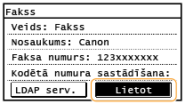 Adrešu grāmatā tiks reģistrēts izvēlētā lietotāja lietotājvārds un LDAP serverī reģistrētais faksa numurs vai e-pasta adrese.