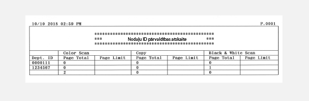 Ja ir iespējota nodaļu ID pārvaldība, varat izdrukāt atskaiti, lai pārbaudītu kopējo kopēto, drukāto un skenēto lappušu skaitu katram nodaļas ID. Pārskets ļauj pārraudzīt lietošanu un uzlabot pārvaldību.