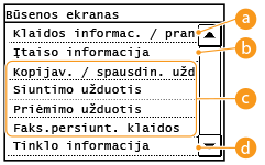 , rodomas ekranas, kuriame galite peržiūrėti spausdinamų, siunčiamų arba gaunamų dokumentų būseną, aparato, pavyzdžiui, dažomųjų miltelių lygio, būseną arba tinklo parametrų informaciją, pvz., aparato IP adresą.