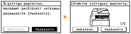 Kai kuriais atvejais, įvykus klaidai, pateikiami nurodymai, kaip reaguoti į klaidą. Norėdami išspręsti problemą, vykdydami ekrane pateikiamus nurodymus. Toliau kaip pavyzdys pavaizduotas ekranas, rodomas užstrigus popieriui (