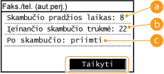 Galite nustatyti, kad aparatas automatiškai priimtų faksogramas, kai priimamo skambučio signalas skamba nurodytą laikotarpį. Įjungti automatinį priėmimą