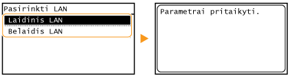 Kai nuspręsite ar aparatą prie kompiuterio prijungti naudojant laidinį ar belaidį LAN, naudodami valdymo skydą pasirinkite laidinį LAN arba belaidį LAN. Atkreipkite dėmesį, kad pakeitus parametrą iš <Laidinis LAN> į <Belaidis LAN> arba atvirkščiai, reikės pašalinti kompiuteryje įdiegtas tvarkykles ir įdiegti iš naujo. Daugiau informacijos žr. internetinių instrukcijų svetainės atitinkamų tvarkyklių instrukcijose.