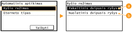 bakstelėkite <Pakaitinis dvipusis ryšys> arba <Nuolatinis dvipusis ryšys>.![]() <Pakaitinis dvipusis ryšys>Pakaitomis siunčia ir priima ryšio duomenis. Pasirinkite, jei aparatas prijungtas prie tinklo įrenginio naudojant pusiau dvikryptį ryšį.