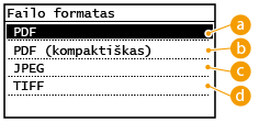 Galima pasirinkti failų formatą, kuriuos bus nuskaitomi dokumentai (pvz., PDF/JPEG/TIFF). Galima rinktis smarkiai suglaudintą PDF failą, kurio dydis yra mažesnis.