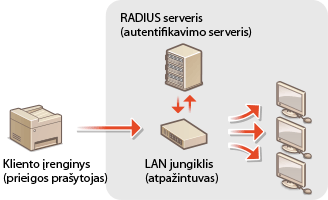 Aparatas gali prisijungti prie 802.1X tinklo kaip kliento įrenginys. Įprastas 802.1X tinklas apima RADIUS serverį (autentifikavimo serverį), LAN jungiklį (autentifikatorių) ir kliento įrenginius su autentifikavimo programine įranga. Jei įrenginys bando jungtis prie 802.1X tinklo, jam taikoma vartotojo autentifikacija norint įrodyti, kad ryšį užmezgė įgaliotasis vartotojas. Autentifikacijos informacija siunčiama į RADIUS serverį ir jis ją patikrina, tokiu būdu leidžiamas arba draudžiamas ryšys su tinklu, atsižvelgiant į autentifikacijos rezultatą. Jei autentifikacija nesėkminga, LAN jungiklis (arba prieigos taškas) blokuoja prieigą už tinklo ribų.