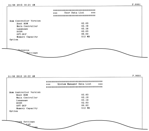 فهرست دادههای کاربر شامل اطلاعات تنظیم برای <Network Settings> و <System Management Settings> نیست. برای بررسی همه موارد تنظیم، لیست داده مدیر سیستم را چاپ کنید.