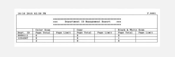 زمانی که مدیریت شناسه بخش فعال شده است، میتوانید برای بررسی کل تعداد کاغذهایی که برای هر شناسه بخش کپی، چاپ و اسکن شدهاند، گزارشی را چاپ کنید. این گزارش به شما امکان میدهد تا روی استفاده نظارت کنید و مدیریت را بهبود بخشید.
