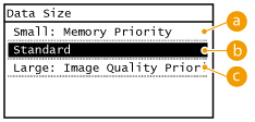می توانید نسبت فشردگی فایل را زمان تبدیل اسناد اسکن شده به فرمت JPEG مشخص کنید. <Small: Memory Priority> نسبت فشردگی را بالاتر از حد عادی قرار می دهد تا فایل های کوچک تر با کیفیت تصویر پایین تر ایجاد شود. به بیان دیگر، <Large: Image Quality Priority> نسبت فشردگی را پایین تر از حد عادی قرار می دهد تا فایل های بزرگتر با کیفیت تصویر بالاتر ایجاد شود.