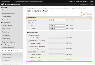 کادر انتخاب را برای فعال کردن تنظیم PIN علامت بزنید. [Department ID]