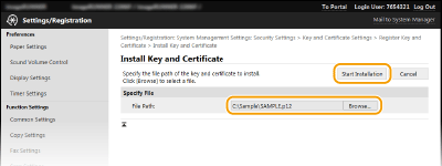 جفت کلیدها و گواهیهای دیجیتال را نمیتوان از یک مرجع صدور گواهینامه (CA) برای استفاده با دستگاه کسب کرد. میتوانید این فایلها را با استفاده از Remote UI (واسطه کاربر از راه دور) از راه دور ذخیره و سپس ثبت کنید. مطمئن شوید که جفت کلید و گواهی مطابق با الزامات دستگاه (