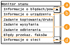 wyświetlony zostaje ekran umożliwiający sprawdzenie statusu drukowanych, wysyłanych lub otrzymywanych dokumentów, a także stanu maszyny np. poziomu toneru w zasobnikach lub danych na temat ustawień sieciowych, np. ustawień adresu IP urządzenia.