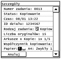 Służy do wyświetlania bieżącego statusu wybranego elementu. Poniżej jako przykład pokazano ekran <Stan zad. kopiowania/drukow.>.