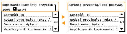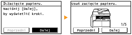 W niektórych sytuacjach po wystąpieniu błędu wyświetlone zostają wskazówki podające, jak na niego zareagować. Aby rozwiązać problem, należy postępować zgodnie z instrukcjami na ekranie. Poniżej jako przykład pokazano ekran wyświetlany w przypadku zablokowania papieru (