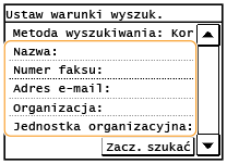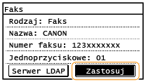 ![]() Jeśli po dotknięciu przycisku <Zacz. szukać> pojawia się ekran uwierzytelnienia, wprowadź nazwę użytkownika urządzenia i hasło zapisane na serwerze LDAP i dotknij przycisku <Zastosuj>. Zapisywanie serwerów LDAP