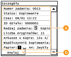 Zostaną wyświetlone: liczba kopii, ustawienia oraz inne informacje. Aby sprawdzić szczegóły kopiowania bez anulowania kopiowania, należy nacisnąć przycisk