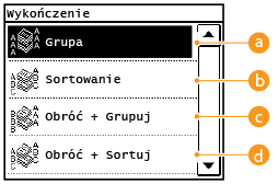 Gdy wykonywanych jest wiele kopii wielostronicowego dokumentu, można wybrać opcję <Grupa>, <Sortowanie>, <Obróć + Grupuj> lub <Obróć + Sortuj>, aby określić układ kopiowanych stron. Funkcja ta jest przydatna podczas przygotowywania kopii dokumentów na spotkania lub prezentacje.