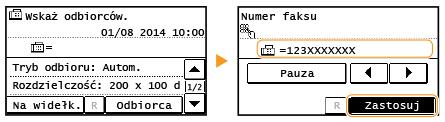 Aby w razie konieczności wstawić pauzę na końcu numeru faksu, dotknij przycisku <Pauza>.