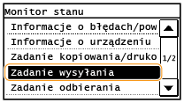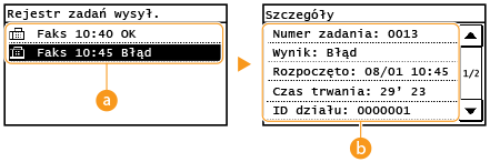 ![]() <Rejestr zadań wysył.>/<Rejestr zadań odb.>Wyświetla listę wysłanych i odebranych dokumentów. Informacja <OK> zostaje wyświetlona w przypadku, gdy przesłano lub odebrano dokument, natomiast jeśli przesyłanie lub odbieranie dokumentu nie powiedzie się lub wystąpi błąd, na ekranie pojawi się informacja <Błąd>.