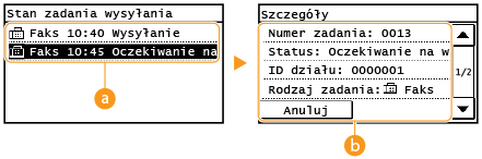 ![]() <Stan zadania wysyłania>/<Stan zadania odb.>Wyświetla listę wysyłanych i odbieranych dokumentów lub dokumentów oczekujących na przetworzenie.
