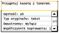 Gdy zasobnik z tonerem jest bliski wyczerpania, zostaje wyświetlony komunikat. Dalsze korzystanie z funkcji drukowania, bez podjęcia odpowiednich czynności, spowoduje pogorszenie jakości druku. Pozostały poziom toneru można sprawdzić na wyświetlaczu.