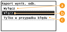 Dzienniki otrzymanych faksów można sprawdzić, drukując Raport wyników RX. Raport można drukować każdorazowo po zakończeniu transmisji lub tylko w przypadku wystąpienia błędu odbierania.
