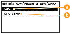![]() <Autom.>Konfiguracja urządzenia w taki sposób, aby automatycznie wybierana była metoda szyfrowania AES-CCMP lub TKIP, zgodnie z ustawieniem routera bezprzewodowego.