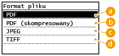 Można wybrać format pliku, w którym zostaną zapisane zeskanowane dokumenty. Dostępne formaty to: PDF/JPEG/TIFF. W przypadku formatu PDF można wybrać takie opcje, jak kompaktowy PDF o mniejszym rozmiarze pliku.