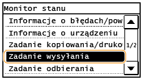 ![]() <Rejestr zadań wysył.>Wyświetlanie listy dokumentów, które zostały wysłane. Komunikat <OK> jest wyświetlany po pomyślnym wysłaniu dokumentu. Jeżeli natomiast wysłanie dokumentu nie powiedzie się, ponieważ zostało anulowane lub wystąpił błąd, na ekranie pojawi się komunikat <Błąd>.