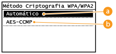 ![]() <Automático>Configura a máquina para selecionar AES-CCMP ou TKIP automaticamente de modo a corresponder à definição do router sem fios.