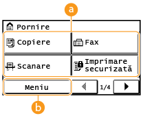 Ecranul <Pornire> pentru iniţierea operaţiilor şi ecranele pentru specificarea setărilor apar pe afişaj. De asemenea, aici puteţi să vizualizaţi progresul lucrării şi mesajele. Atingeţi afişajul pentru a-l acţiona.