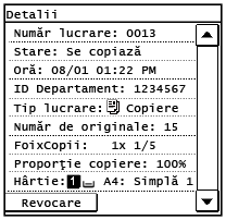 Afişează starea curentă a articolului selectat. Mai jos se afişează ecranul <Stare lucrare copiere/tipărire> ca exemplu.