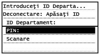 Când este afişat ecranul de conectare, urmaţi procedura de mai jos pentru a introduce ID-ul de departament şi codul PIN.