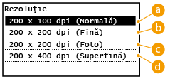 Puteţi selecta rezoluţia să se potrivită pentru tipul de document. Cu cât este mai mare rezoluţia, cu atât imaginea va fi mai clară, dar va dura mai mult trimiterea.