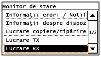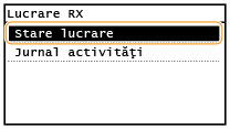Vă permite să imprimaţi Raportul de rezultate RX de fiecare dată când documentele sunt stocate în memorie. Pentru a imprima rapoarte, atingeţi <Pornit>. Trebuie să setaţi şi <Raport rezultat RX> la <Pornit>.