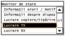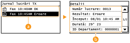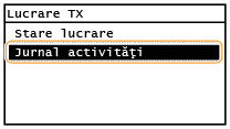 ![]() <Jurnal lucrări TX>/<Jurnal lucrări RX>Afişează o listă a documentelor care au fost trimise şi primite. <OK> este afişat când un document a fost trimis sau primit corect şi <Eroare> este afişat când un document nu a putut fi trimis sau primit deoarece a fost anulat sau a avut loc o eroare.