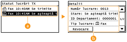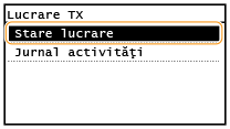 ![]() <Statut lucrări TX>/<Statut lucrări RX>Afişează o listă de documente care sunt trimise şi primite sau aşteaptă să fie procesate.