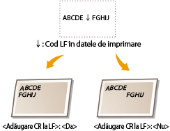 Selectaţi dacă să adăugaţi funcţie de sfârşit de linie (CR) când aparatul recepţionează un cod linie nouă (LF). Dacă se selectează <Da>, poziţia de imprimare se mută la începutul următoarei linii când aparatul recepţionează un cod LF. Dacă se selectează <Nu>, poziţia de imprimare se mută la următoarea linie, chiar sub codul LF recepţionat.