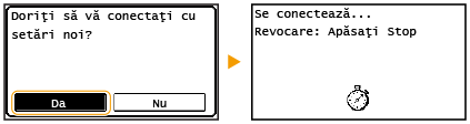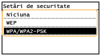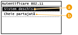 ![]() Când este selectată opţiunea <Sistem deschis> Conectarea la o reţea LAN wireless, aparatul întâmpină o eroare de autentificare dacă autentificarea cheii partajate este setată la ruterul wireless. Dacă se întâmplă acest lucru, aparatul schimbă automat setarea în <Cheie partajată> şi încearcă din nou conectarea. |