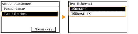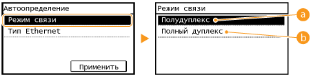 нажмите <Полудуплекс> или <Полный дуплекс>.![]() <Полудуплекс>Данные связи попеременно отправляются и принимаются. Выберите этот режим, если аппарат подключен к сетевому устройству с использованием полудуплексной связи.