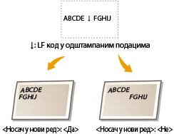 Изаберите да ли се додаје ознака за завршетак реда (CR) када апарат прими шифру за прелазак у следећи ред (LF). Ако је изабрано <Yes>, положај за штампање се премешта на почетак следећег реда када апарат прими LF шифру. Ако је изабрано <No> , положај за штампање се премешта у следећи ред, одмах испод примљене LF шифре.